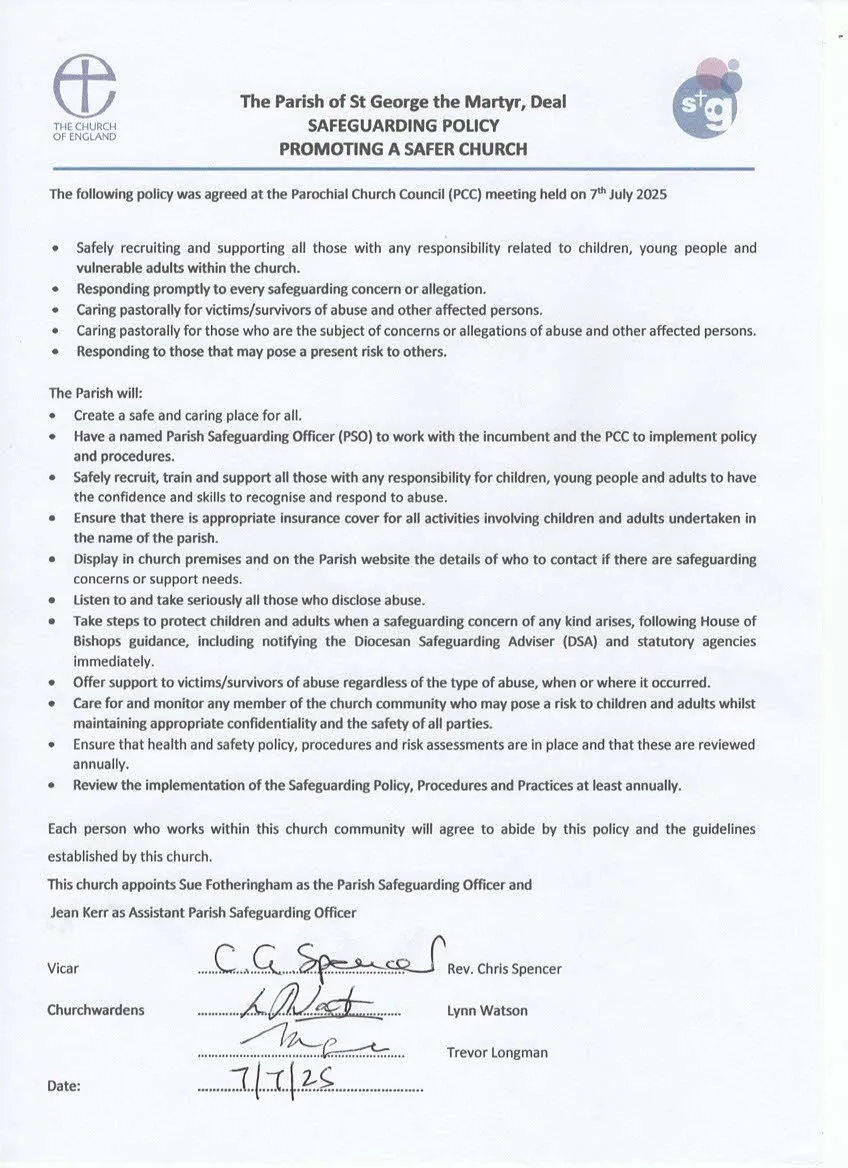 To ensure that this happens, we follow the House of Bishops guidance and policies and work closely with the Diocesan Safeguarding Officers in the Diocese of Canterbury.